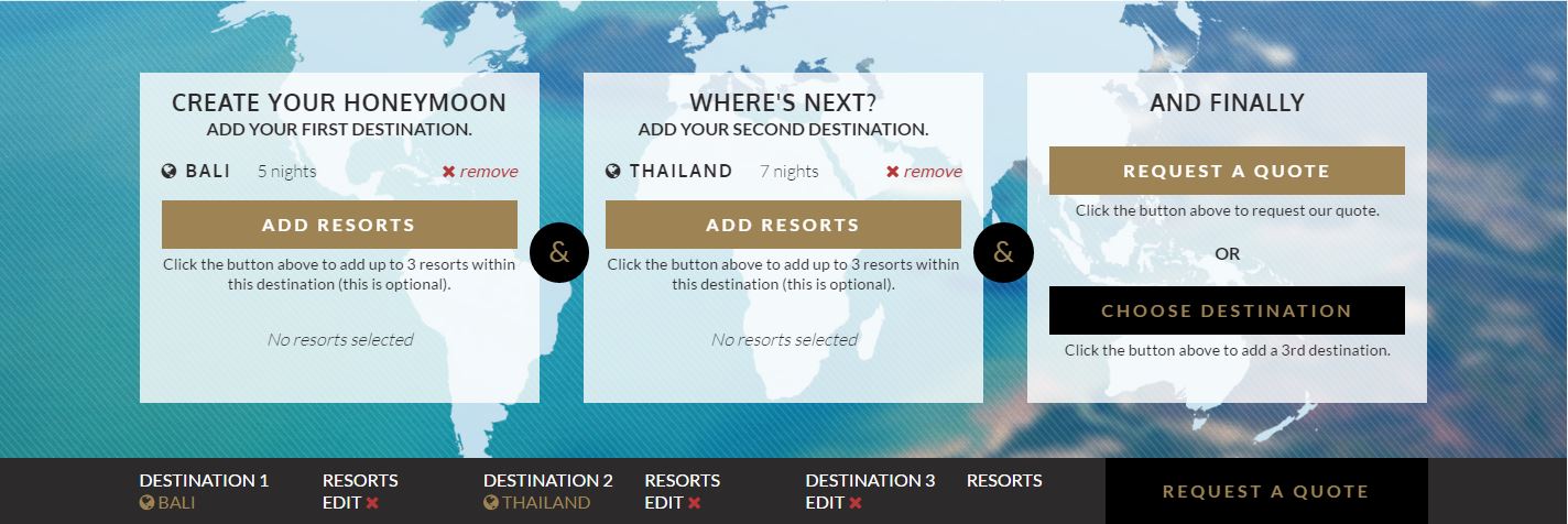 The website was designed so that it allows users to choose where to go, how many nights to stay and is programmed so that on multi-destination holidays, only destinations that make logical sense are suggested to ensure that a customer is not flying 14 hours from one part of their holiday to the next.